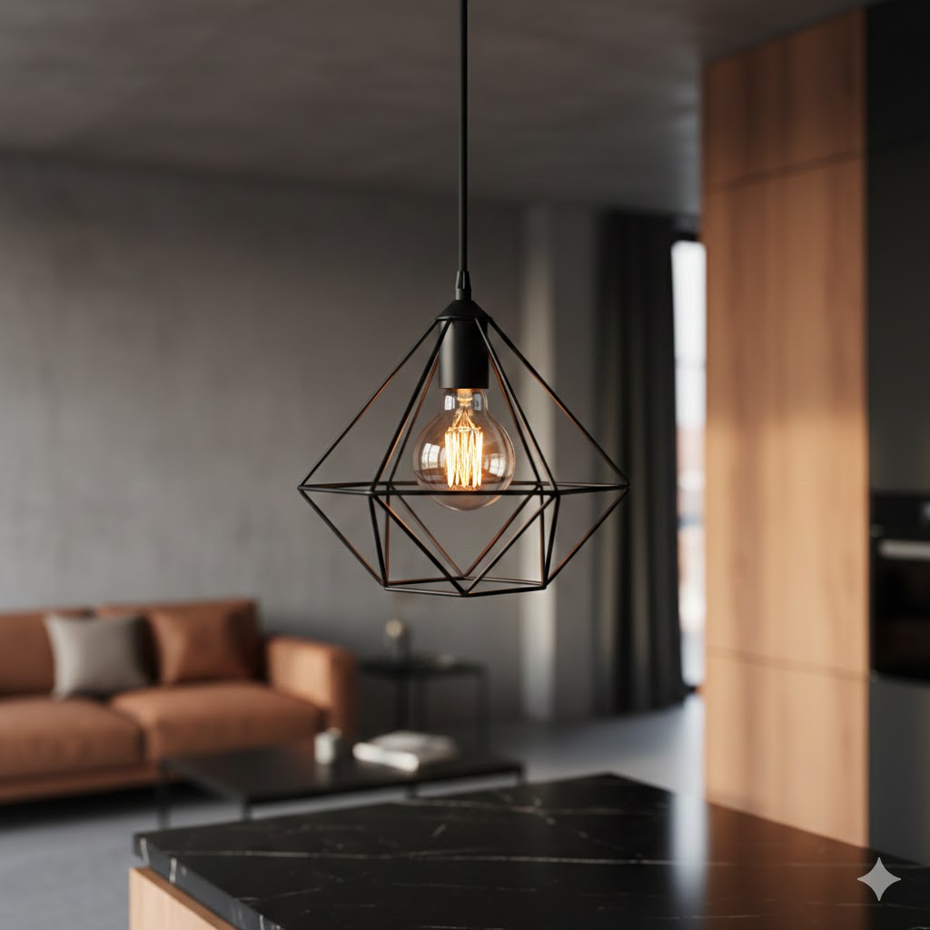 Dê um upgrade instantâneo na sua decoração com o Pendente Aramado Diamante. Com seu design geométrico inspirado na lapidação de pedras preciosas, ele traz modernidade e leveza ao ambiente. O acabamento em preto fosco garante sofisticação e combina perfeitamente com salas de jantar, balcões de cozinha ou até aquele cantinho de leitura.